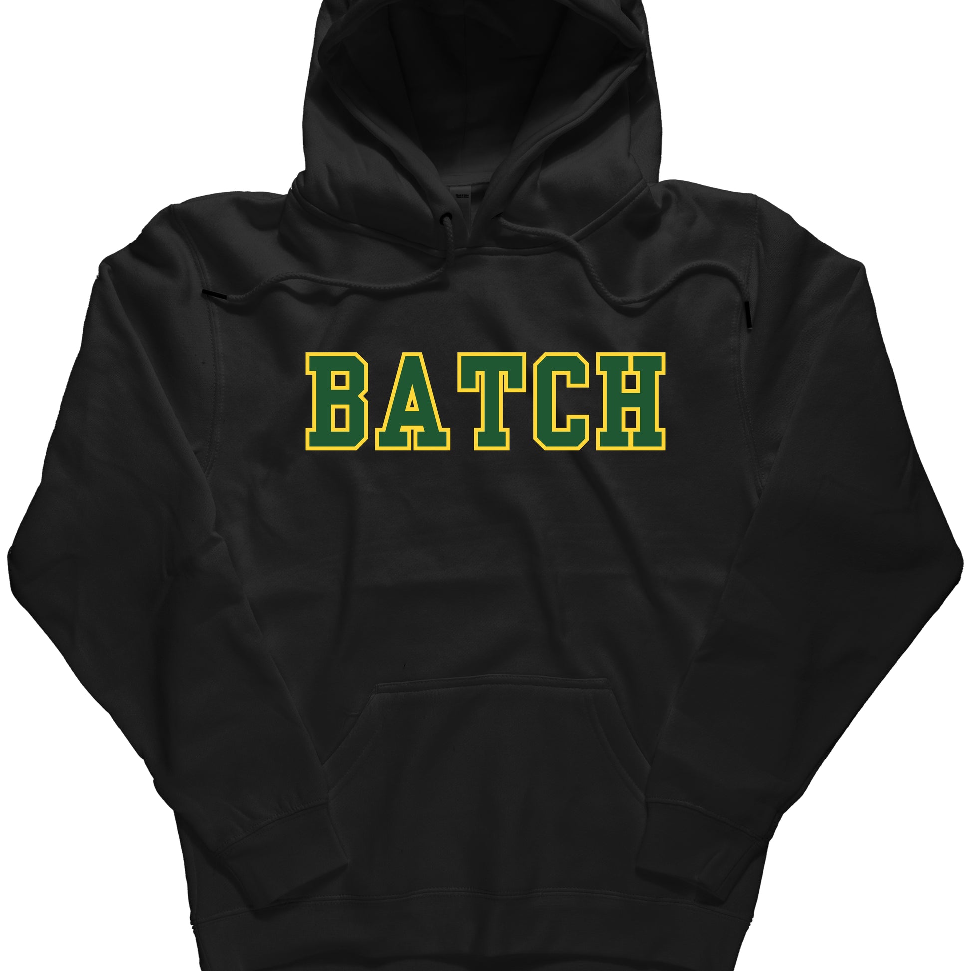 Classic black hoodie featuring “BATCH” printed straight across the chest in green and yellow. Cozy, clean, and perfect for showing your Batch pride,